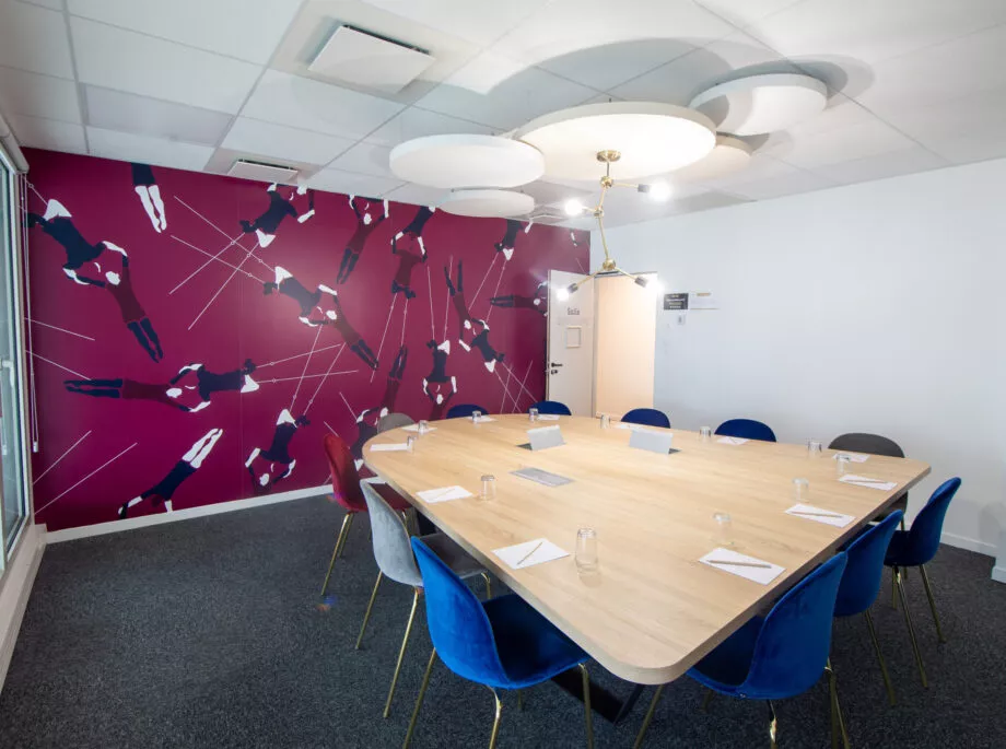 Salle de 26m² pour 12 personnes maximum, équipée d’un écran plat, 1 paperboard, carafe d’eau, bloc-notes et crayons.