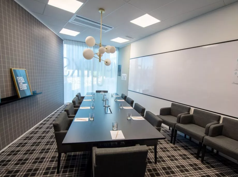 Salle de réunion de 25 m2 pour 14 personnes maximum en style U, grande table noire connectée, équipée d’un écran plat, une visioconférence, 1 tableau blanc, carafe d’eau, bloc-notes.