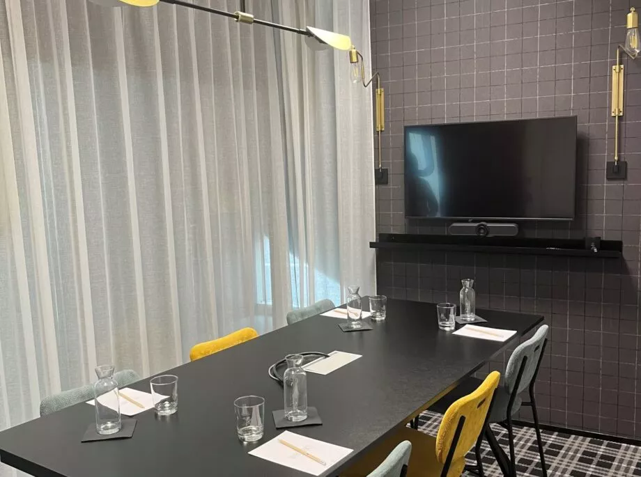 Salle de réunion de 11m2 pour 6 personnes maximum en style U, table haute noire connectée, équipée d’un écran plat, une visioconférence, 1 tableau blanc, carafe d’eau, bloc-notes.