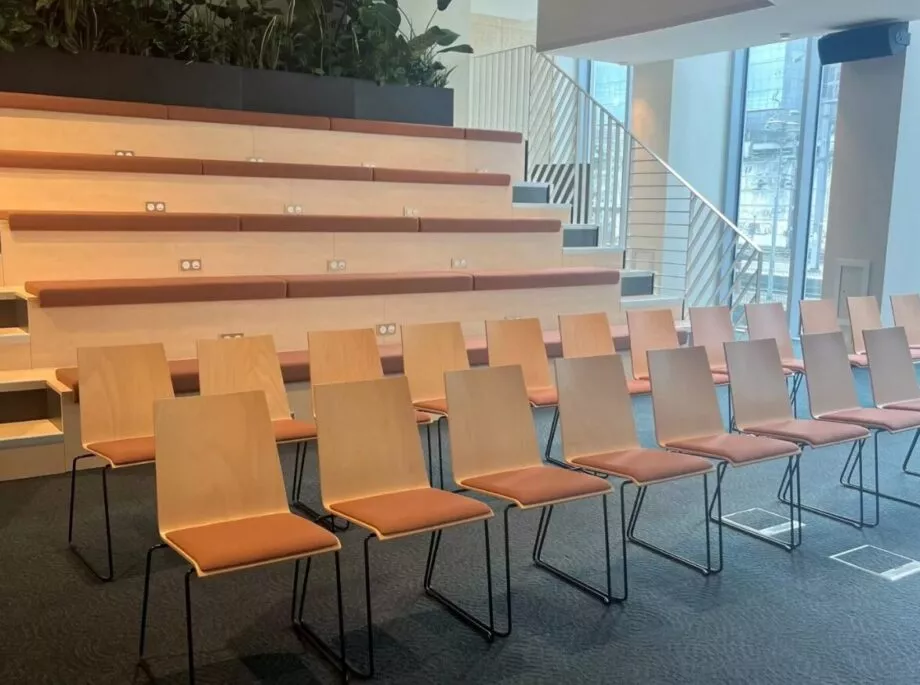 Salle de 110m² pour 70 personnes maximum en assise version théâtre, équipée d’un écran plat, un paper Board, carafe d’eau.