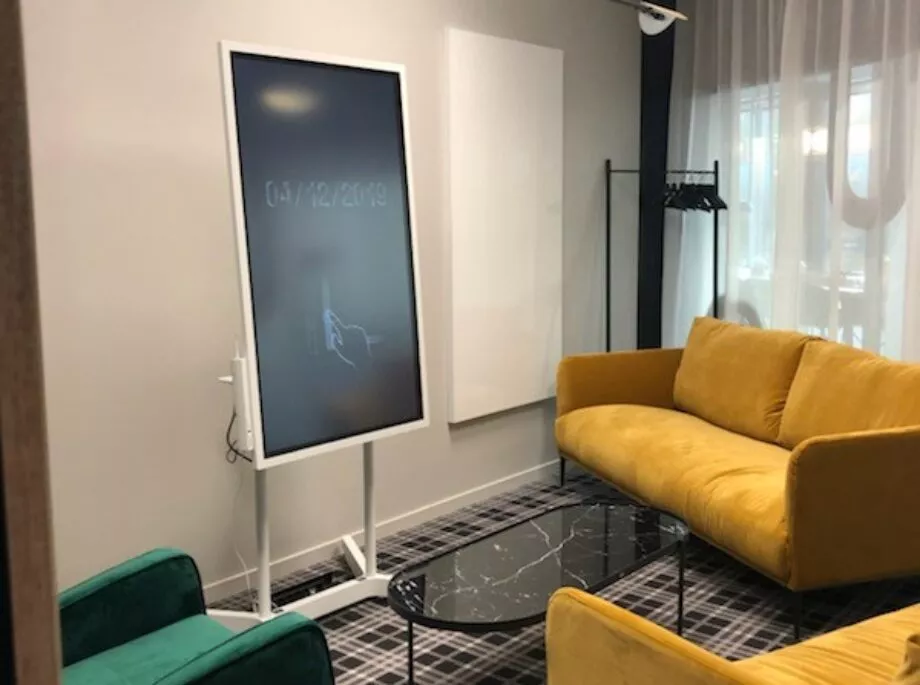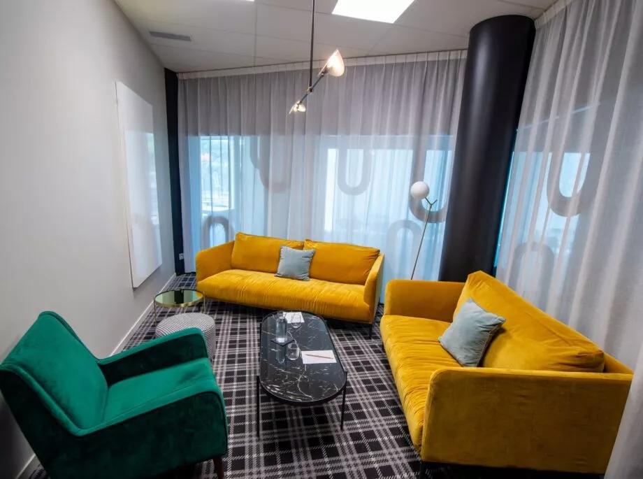 Salle de réunion format salon de 16m2 pour 6 personnes maximum, canapé, équipée d’un écran plat, une visioconférence, 1 tableau blanc, carafe d’eau, bloc-notes.